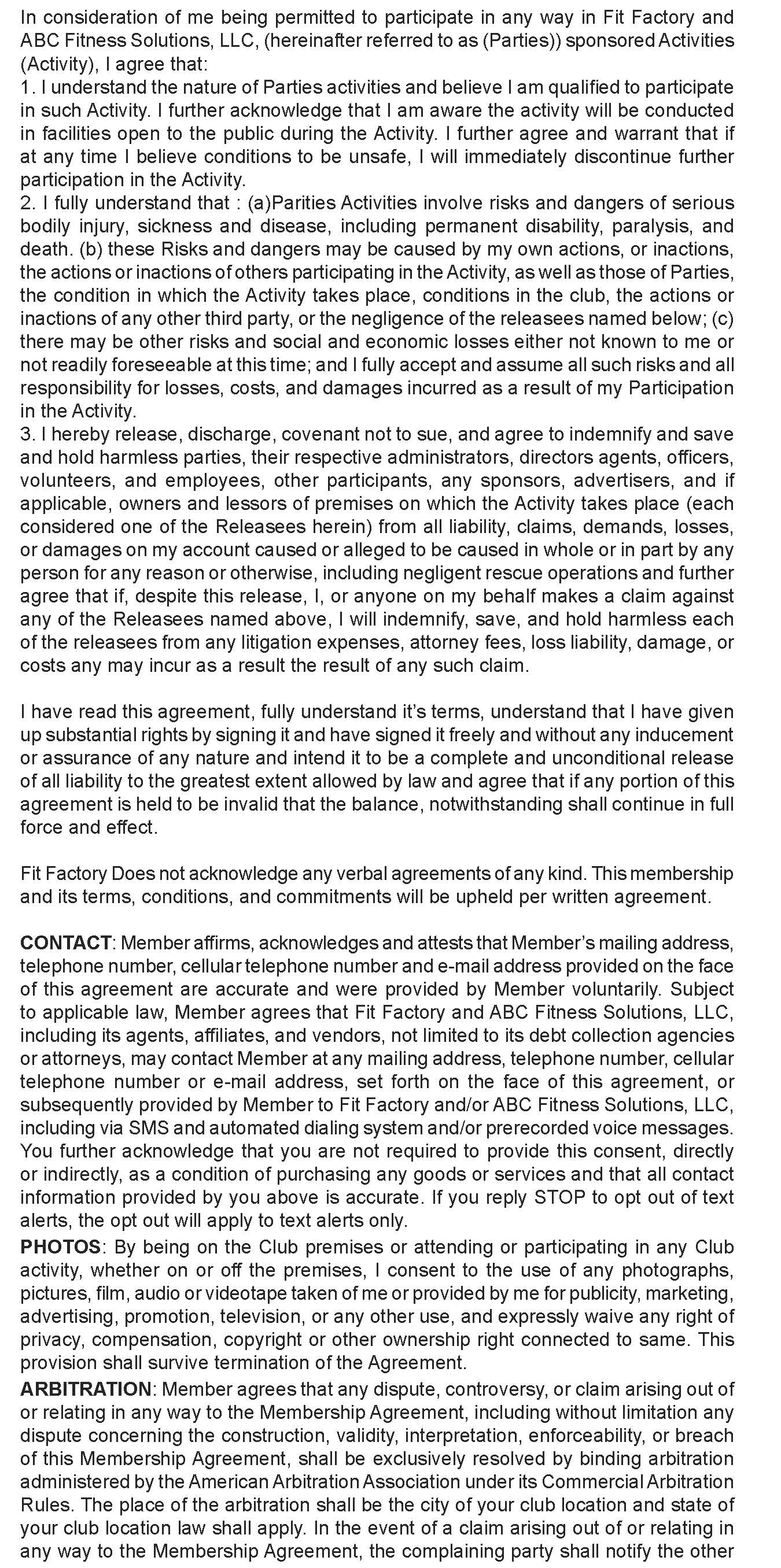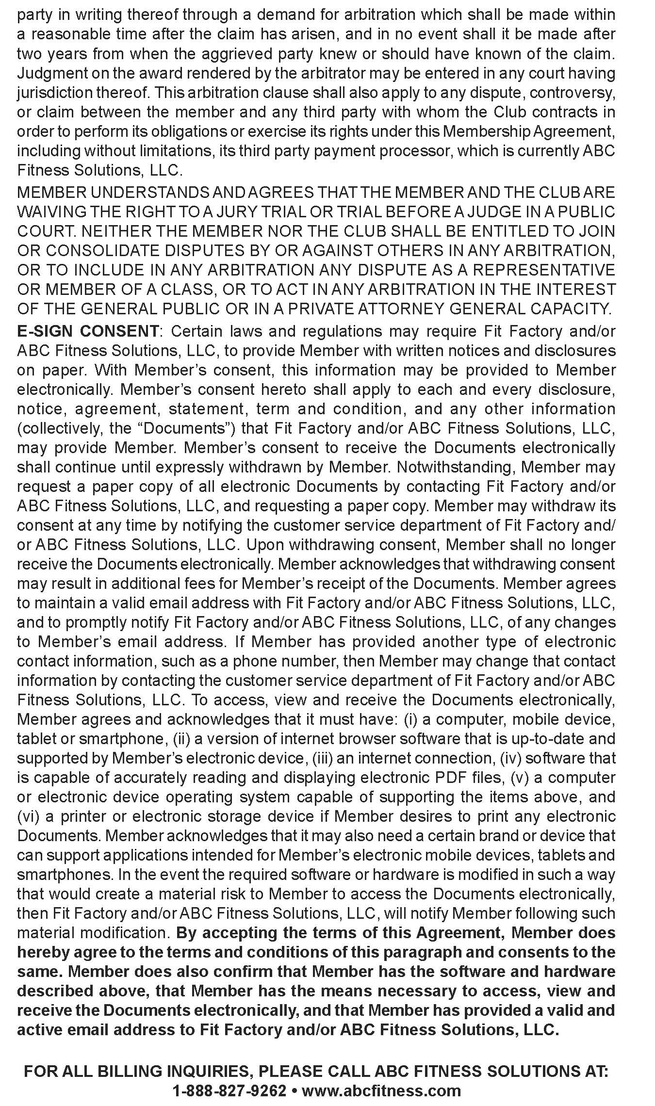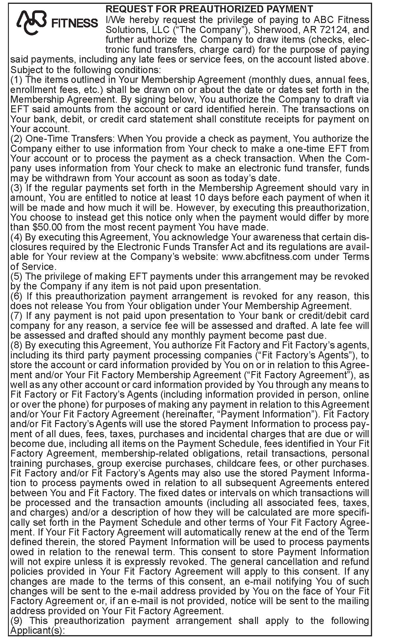 ABC collects information about you that is provided in conjunction with your purchase of services from one of ABC’s health club clients, including information provided on your health club membership agreement(s) and personal training agreement(s). Information about you is typically obtained from the agreement you sign with the club from whom you purchase services. Your personal information may also be collected from you when you provide information directly to ABC in any manner, or when you update account or contact information at the club or online. The information ABC collects about you may include your name, postal address, email address, phone numbers, bank account or credit card information, audio recordings of phone calls with you or made in relation to your account, photographs voluntarily taken at the club, and e-mail correspondence with you or in relation to your account. ABC collects such personal information about you for the purpose of processing and collecting payments owed by you to the club, to contact you in relation to your health club account, and to otherwise provide third party payment processing and administrative services to your club. ABC uses information it collects to communicate with health club members, collect payments owed to its health club clients, and maintain up to date account information for members. ABC’s Privacy Policy is available at https://www.abcfinancial.com/privacy-policy/.