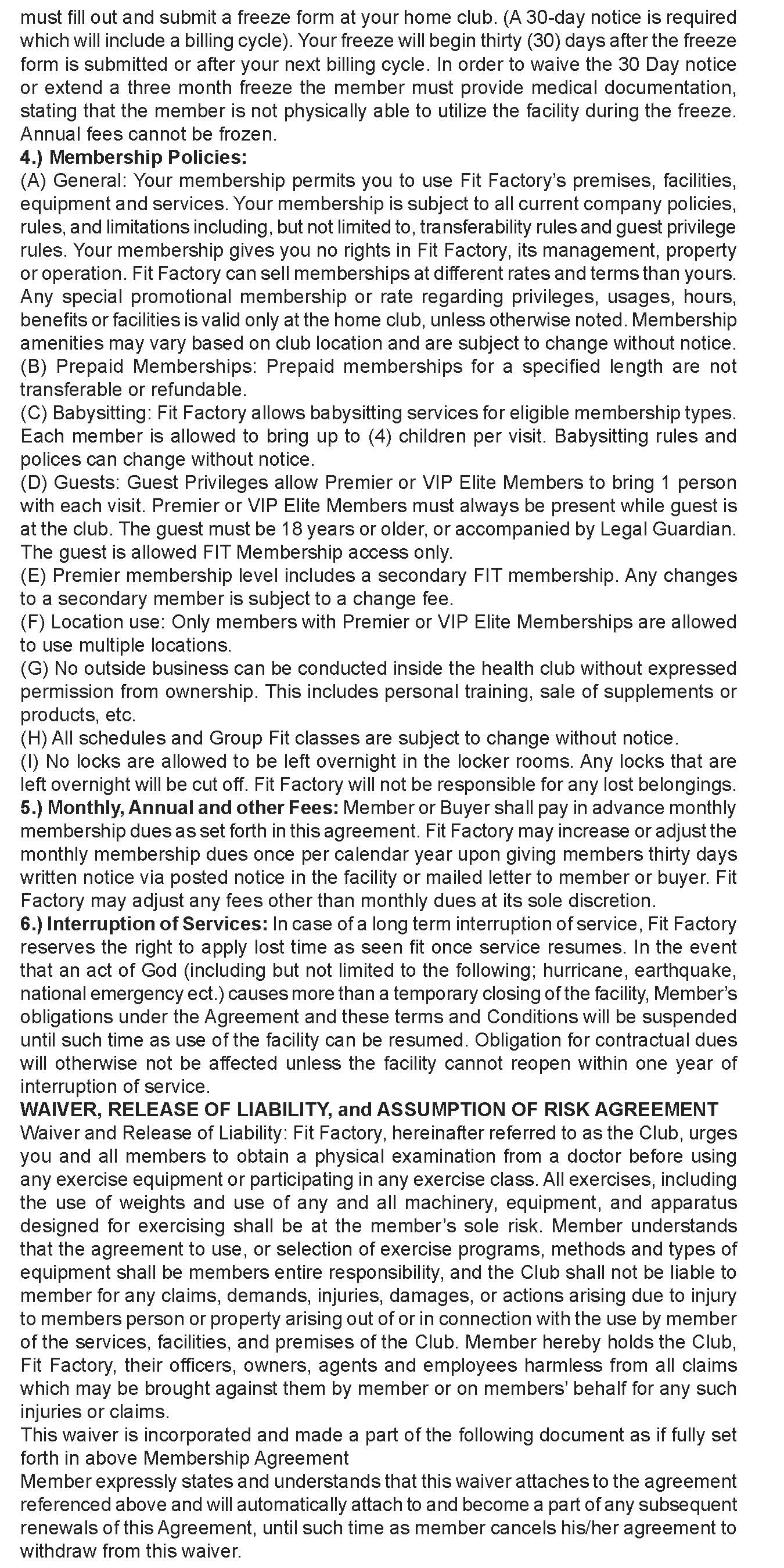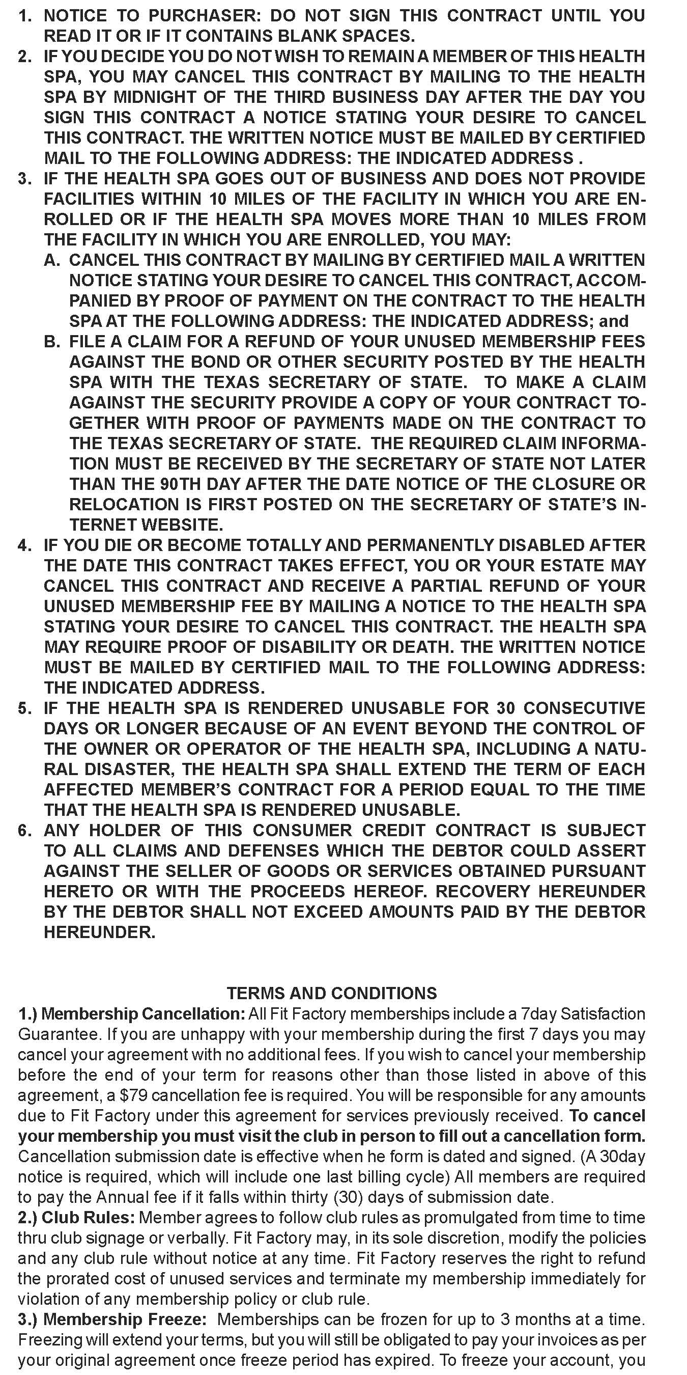 By executing this Agreement, you authorize Club and Club’s agents, including its third party payment processing companies ("Club’s Agents"), to store the account or card information provided by You on or in relation to this Agreement and/or Your Club Membership Agreement ("Club Agreement"), as well as any other account or card information provided by You through any means to Club or Club’s Agents (including information provided in person, online or over the phone) for purposes of making any payment in relation to this Agreement and/or Your Club Agreement (hereinafter, "Payment Information"). Club and/or Club’s Agents will use the stored Payment Information to process payment of all dues, fees, taxes, purchases and incidental charges that are due or will become due, including all items on the Payment Schedule, fees identified in Your Club Agreement, membership-related obligations, retail transactions, personal training purchases, group exercise purchases, childcare fees, or other purchases. Club and/or Club’s Agents may also use the stored Payment Information to process payments owed in relation to all subsequent agreements entered between You and Club. The fixed dates or intervals on which transactions will be processed and the transaction amounts (including all associated fees, taxes and charges) and/or a description of how they will be calculated, are more specifically set forth in the Payment Schedule and other terms of Your Club Agreement. If Your Club Agreement will automatically renew at the end of the Term defined therein, the stored Payment Information will be used to process payments owed in relation to the renewal term. This consent to store Payment Information will not expire unless it is expressly revoked. The general cancellation and refund policies provided in Your Club Agreement will apply to this consent. If any changes are made to the terms of this consent, an e-mail notifying you of such changes will be sent to the e-mail address provided by You on the face of Your Club Agreement or, if an e-mail is not provided, notice will be sent to the mailing address provided on Your Club Agreement.